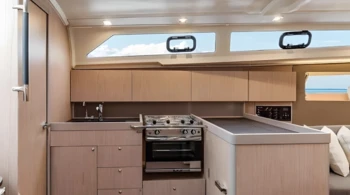 Vela mayor con sables forzados Molinete eléctrico Cojines de bañera Cocina de gas Horno Cubierta amplia