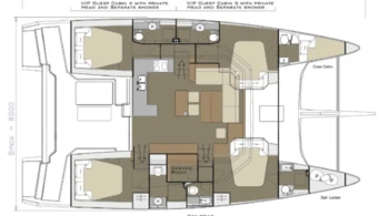 For rentals with a skipper, a cabin must be assigned for him, and access to a bathroom must be provided.