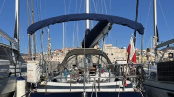 Bimini Fully battened mainsail Electric windlass GPS cockpit plotter Bow thruster Oven