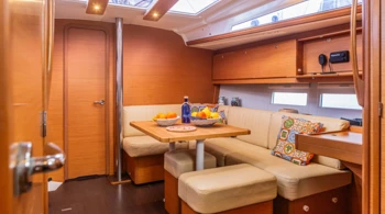 Globalement beaucoup d'espace à l'intérieur pour un bateau de cette taille qui est donc confortable. Les couchettes sont spacieuses et 3 salles de bain à bord, c'est du luxe. Le cockpit est aussi agréable. Voiles faciles à hisser / dérouler. Réserves d'eau douce et de Gasoil très larges (faible consommation).